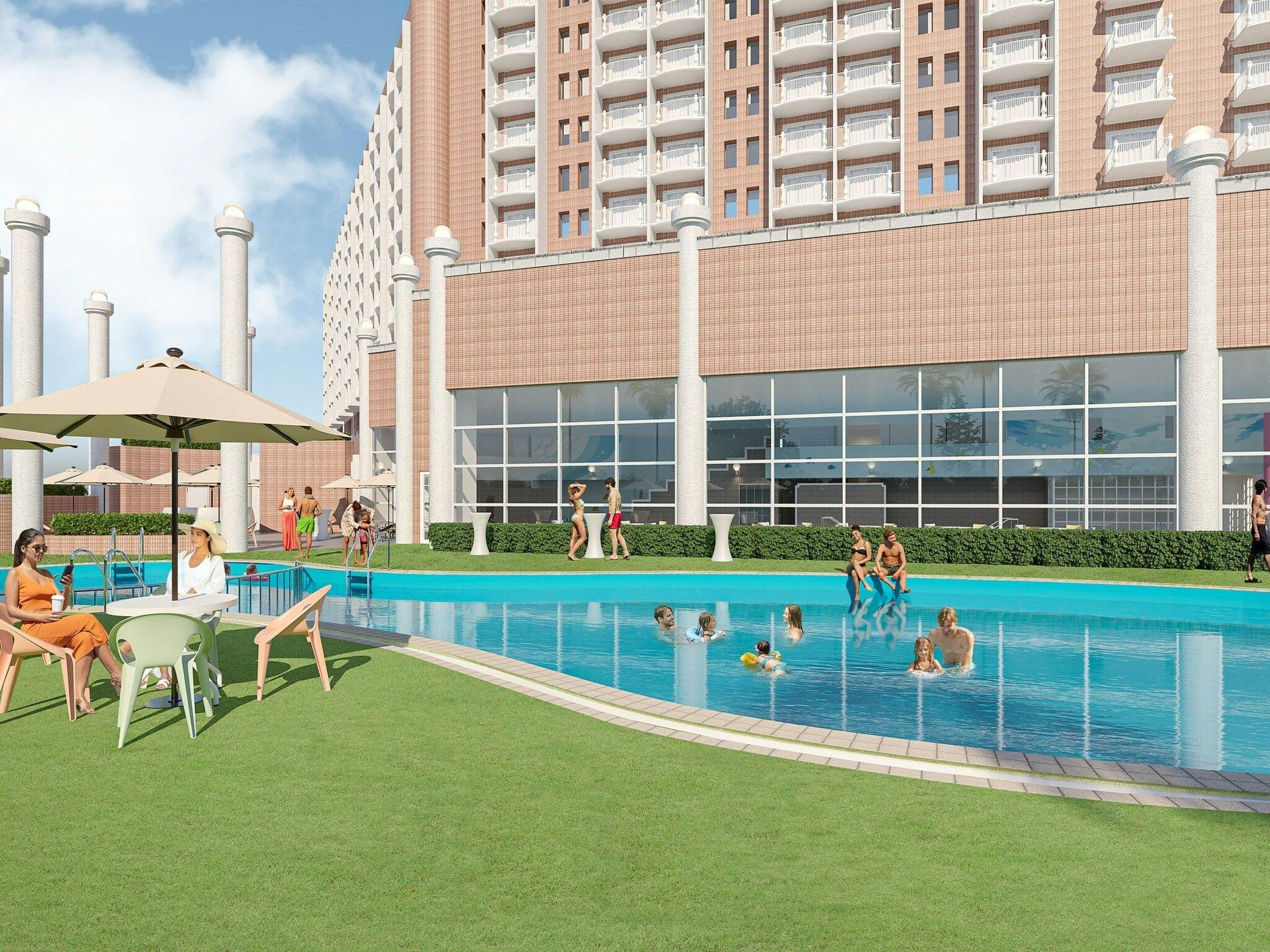 - 一日中水着で過ごせるプールクラブがテーマ。インフィニティープールあり